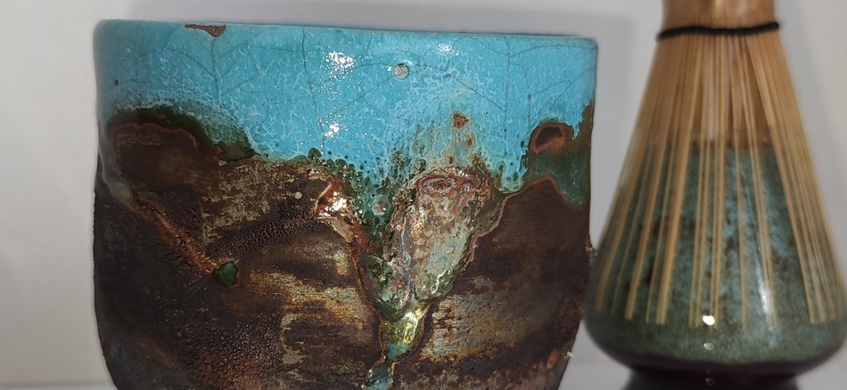This one is not so raw. I named it 'The smurf" because of that candy looking blue. Metallic stains are reflecting the light and changing its colour. That blue and metallic stains makes nice contrast with naked dark brown body of chawan.