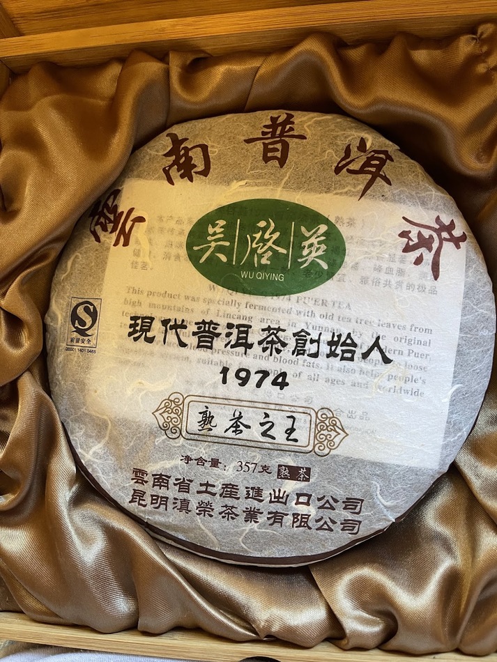 I have a round brick in a wooden box that says Wu Qi Ying Fermented Pu'er Inventor 1974 357 that someone gave me. Honestly, I am unlikely to drink it (even though I love other teas, I only drink caffeine free) and was considering giving it to a friend. It occurred to me that it might be worth a lot of money and I should find that out before I give it away. Can someone tell me a range of what it is worth?