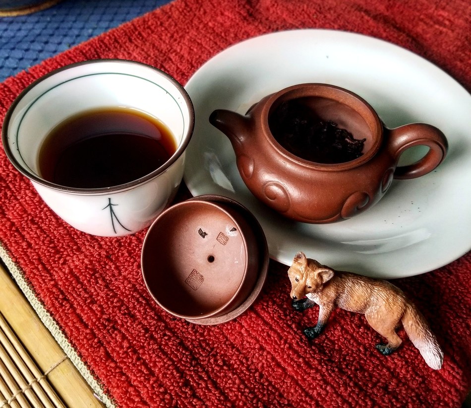 Steeped a mysterious "brick shou" from LP. Not much more info than that. I suspect it is the 2018 Dragon Brick, a shou puerh brick from XiZiHao, since that is the only brick shou he sells.