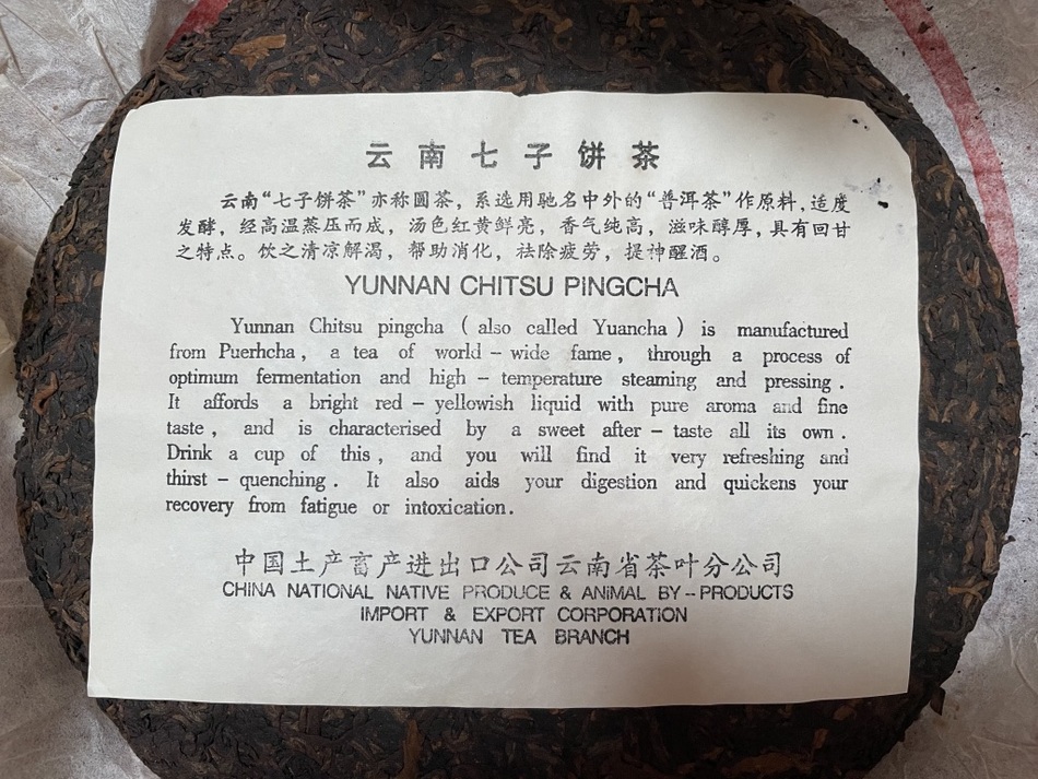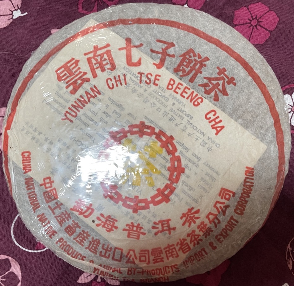 I think the trick to identifying it is the color of the tea character. Vivid yellow was not a standard color. The wrapper looks like it uses Traditional instead of Simplified Chinese characters. Also it says something under the tea character besides "Zhongcha Brand". Might be an homage to the cakes from the 80s? Kam Chan Pong says that "Yunnan Chi Tse Beeng Cha" in a bigger English font rather than a smaller font was a popular printing style of the 1980s on cake wrappers.