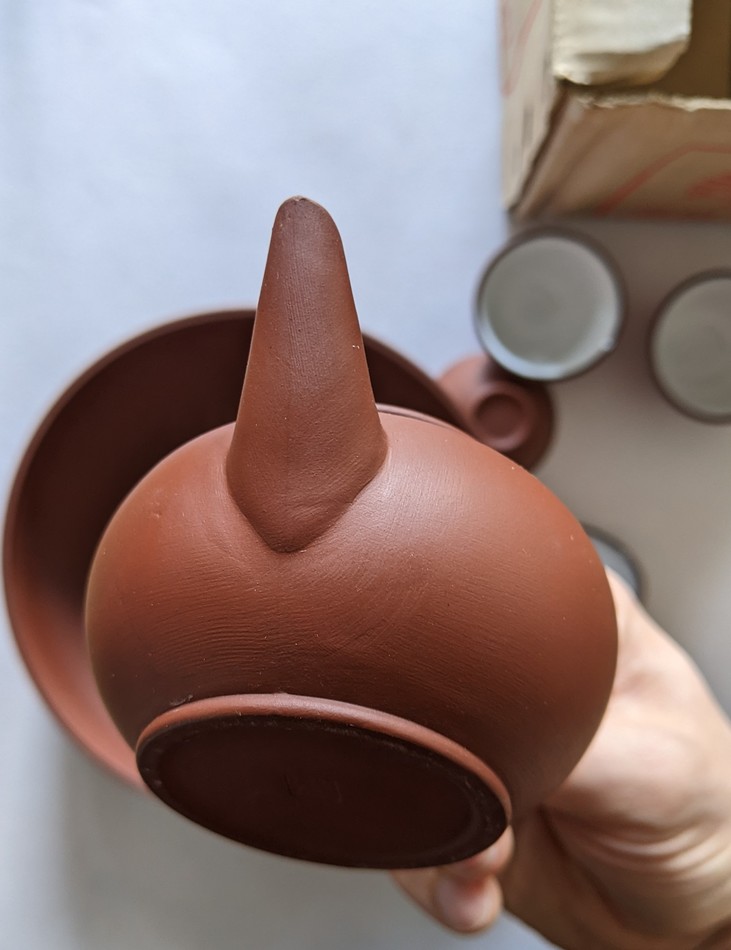 By no means masterpieces here, but maybe interesting in a historical context or as a curiosity... Here is an example of another Tong Fon/Dong Feng or in this case Tong Fong tea set complete (as far as I know) in the box, as well as some cups and saucers found separately. I have no idea when this would have been produced, but the clay of this set is quite different from the clay of the 80s pot I have. This pot was looks to be slipcast as a complete single piece given the visible mold line - the clay has the look like it has a painted slurry texture on the outside but I think this is just the clay itself and the texture being the result of a release agent. The 80s pot I have is molded in pieces and then assembled. The set of cups and set of saucer also are a different looking clay from each other, but after just a bit of soaking seem like they would take on a nice patina quite quickly. The saucers are a nice small size to go well with CZ style cups so they should at least see some use when its time for the rare oolong gong-fu session around here.