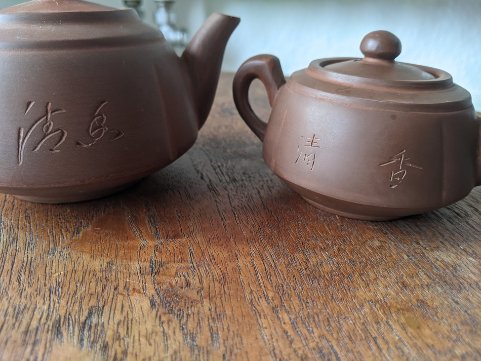 It was being described as a yixing, and I picked it up with a tray and cups, though clearly not a set. I neat little collectable; I can't quite puzzle out if it's supposed to be a fish, a dragon, or a ram. Four hole filter, tiger striping, and a terrible-fitting lid.