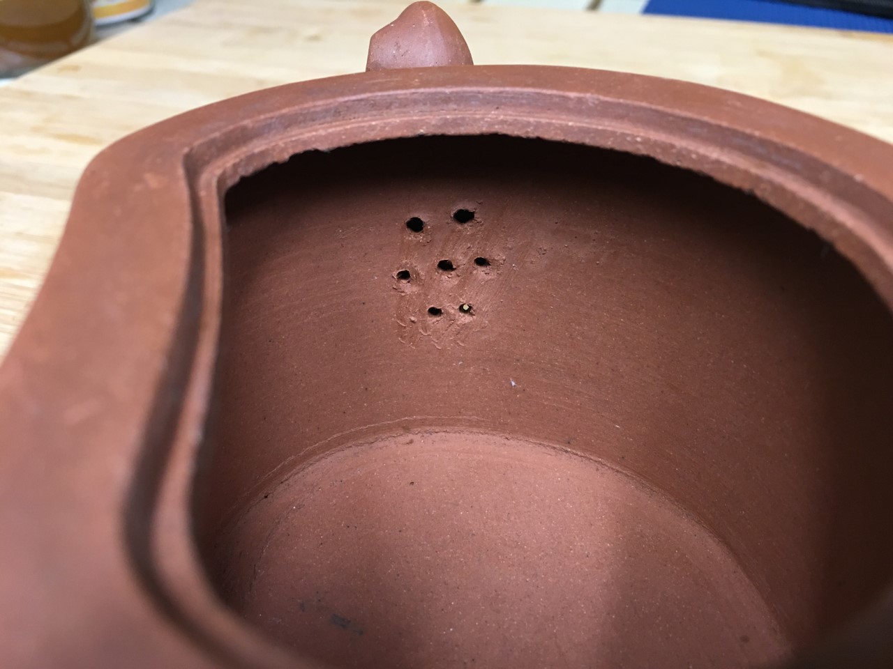 Talking about the repair, the holes are quite interest. From what I can imagine, it seems when the maker was making the 6 holes filter, the tool went too deep and stabbed the surface where the sprout and the bottom connects, and it left 2 bumps after firing. After long time usage, the surface of the bumps slowly wear out and became 2 tiny holes. However, this still doesn't make sense because modern artist typically drill the filter holes prior to installing the sprout. Unless installing the sprout then drill filter holes was a practice back in the days![]()