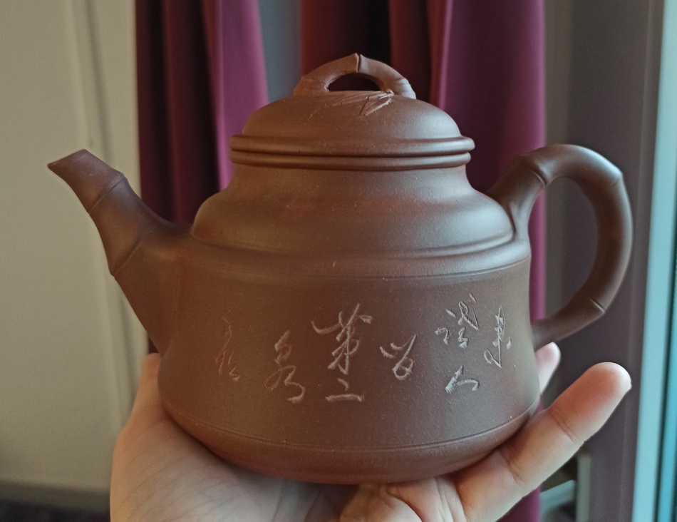Nothing exciting to write home about amidst all of the vintage wares on here, but here's a shot of one of the smaller 90ml modern hongni pots on offer from EoT in action. I planned on splurging on a 70s pot, but decided to hold off for the time being. Originally intended for yancha, but have been feeding it Taiwanese oolongs and red tea, with good results. Nice clay and well made. Influence on tea is discernible but not transformative (as one would expect). Slightly muting, slightly rounding, slightly sweetening. Certainly to get better over time with more seasoning. I will say one thing though - handling mostly Japanese wares of late has made me spoiled for ergonomics, which I find slightly lacking in this pot. I don't know if it's a shuiping thing (that I haven't noticed before), but the handle of the pot is quite thin in terms of girth, and when filled to the brim with leaf and water, it lacks balance in the hand. It's difficult to hold horizontally to the ground as it sort of wants to rotate downward, and the grip shown below is the only one that I find comfortable. But for a modern, accessible pot, with seemingly good clay, can't really complain.