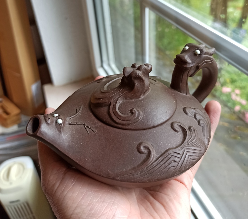Very cool teapot, the expressions from those dragons look lively haha. I own a decor pot that has a foo dog with blue eyes riding on a dragon turtle. The pot is about 500-800 ml, and I use it to water my plants ;)