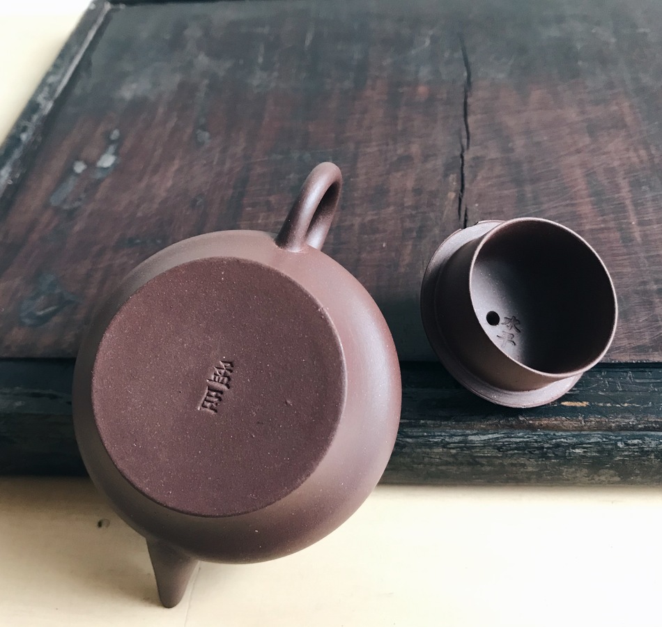 The clay is superb, it reminds me of modern Dicaoqing, although the name of this clay did not exist yet when this pot was made. Deep purple brown, fired very high. I’ve encountered this kind of outstanding Zini a few times and without exception only on very high quality, well made pots. The pictures show it when I cleaned it, now it’s gathered a lovely patina in very short time, again rivalling the Zhuni pots next to it…