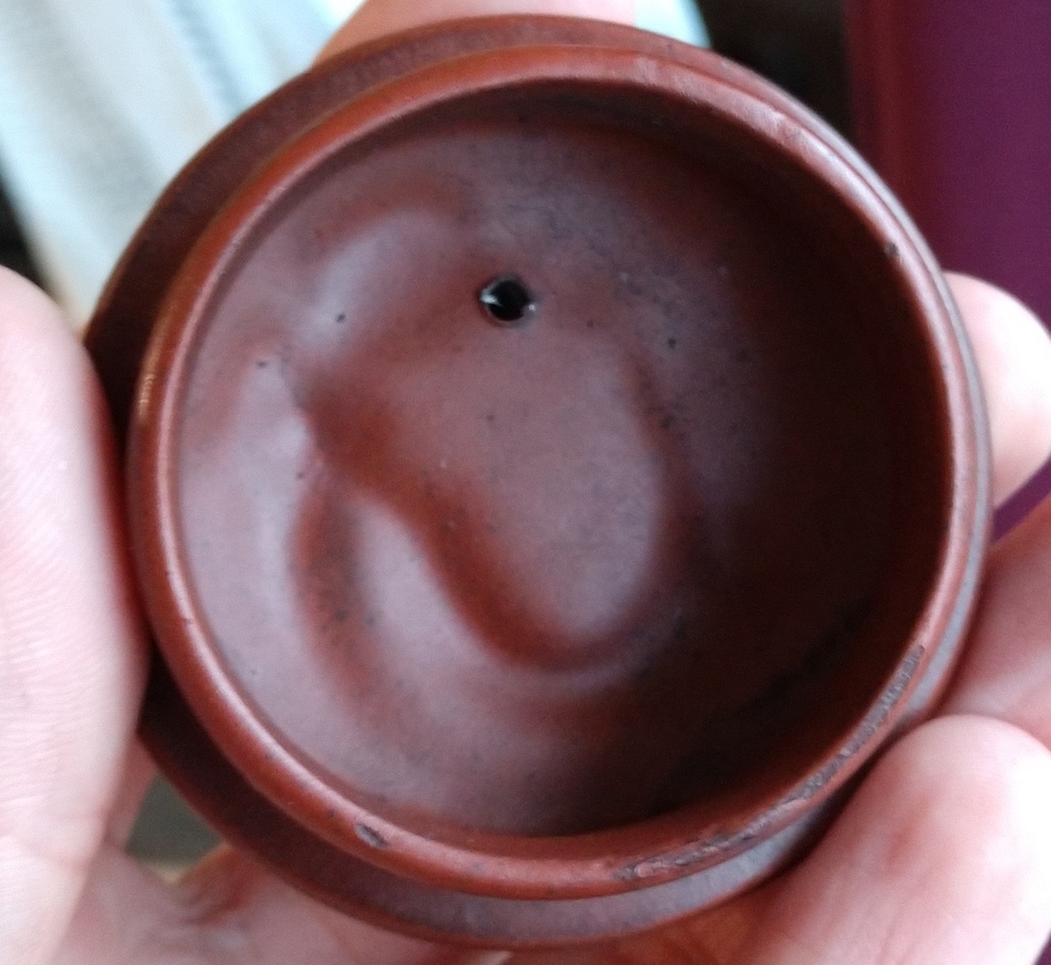 This is a new (cheap) acquisition. I don't know the clay or age. The pot was used before, since there were still tea leaves in it. I hope it is safe to drink from it. It definitely needs a proper cleaning first.