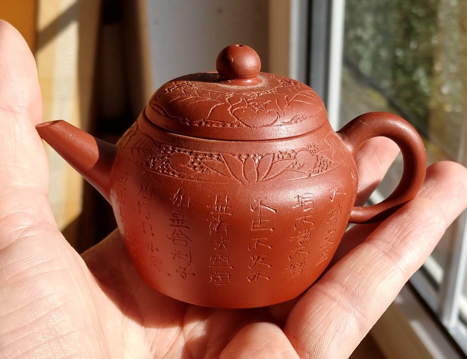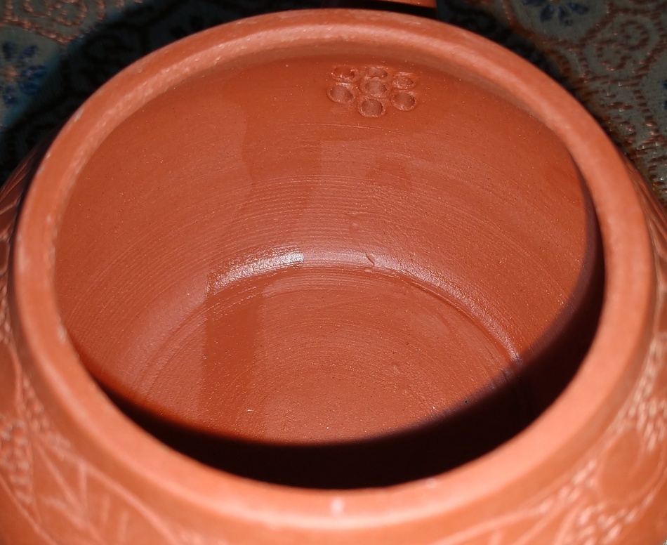 @Simniak somehow the shiny ness of this pot, plus the lines, make think this is not pure Yixing clay at all... full of additives and the colour is not quite right for real Hongni either. Apple shape is a bit off the classic version but that’s just an indication that it is a later style.