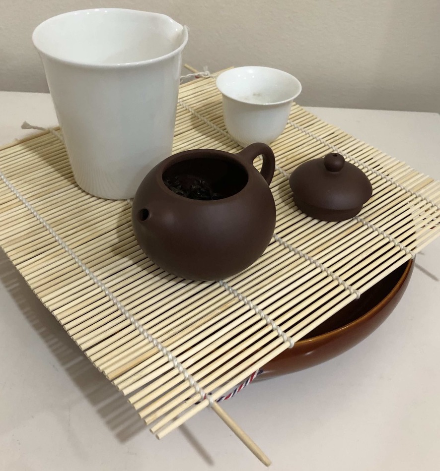 It's not glamorous, but I like the look of it. The water reservoir tray is heat-resistant, waterproof, and quick to dry. The mat easily bears the weight of my teaware without any risk of chipping the porcelain or clay. Tea drains through it immediately and completely. The mat will be easy and cheap to replace (I could even buy a pack of bamboo skewers and make it by hand if I wanted). So far, it's been perfect!