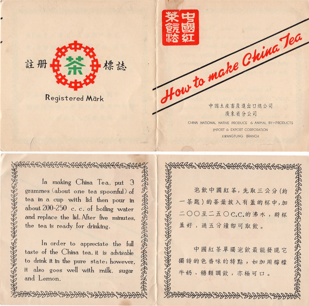 On the large tin (nominally 250g), the company is called 中國茶葉土產進出口公司廣東省茶葉分公司 (in traditional characters), China National Tea & Native Products Import & Export Corporation, Kwangtung Tea Branch. The leaflet (中國紅茶飲法) came to me with the large tin and may well have been originally paired with it, although the company name is again different.