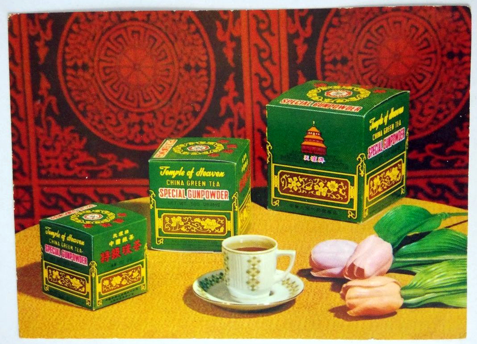 A postcard ad explaining the Temple of Heaven brand gunpowder green tea options available in paper packets instead of tins.