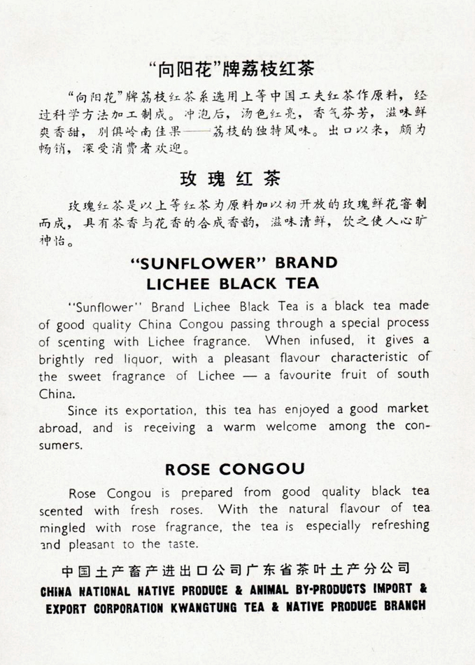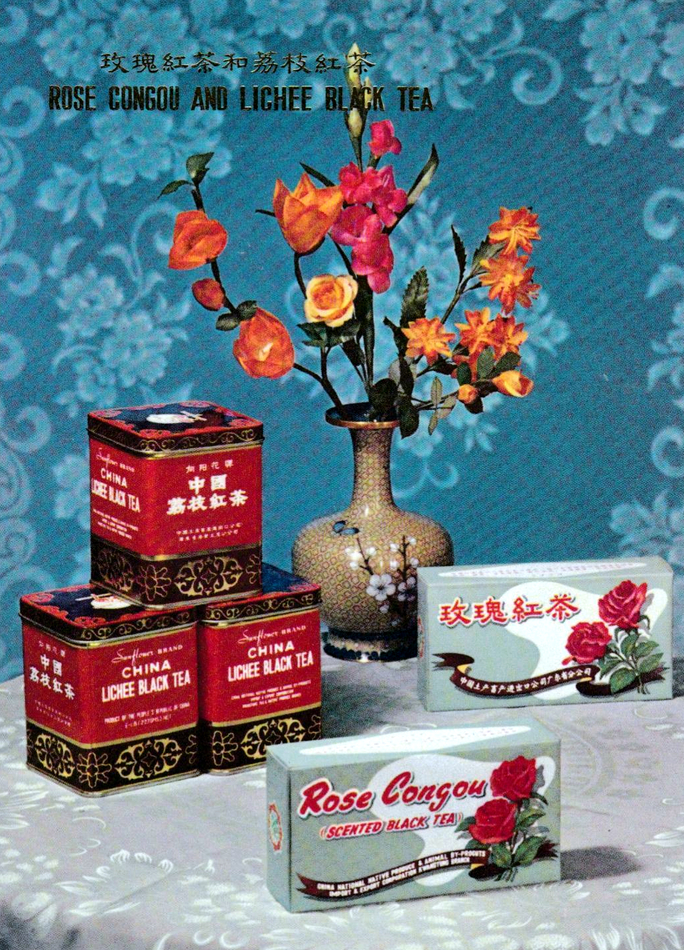 An ad for Sunflower brand lychee congou and paper-packet rose congou, and also some Sprouting brand rose congou in tin form. I wish I knew more about them -- does anyone know anything about the history of these two tea-styles?