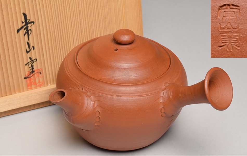 Here are two other kyusu attributed to Jozan Kiln rather than Jozan III himself. Using 常山窯 (Jozan kiln) chop. Notice the bulbous lid knob, and sack at base of spout. This is a characteristic I have noticed with a few Jozan Kiln attributed pieces.