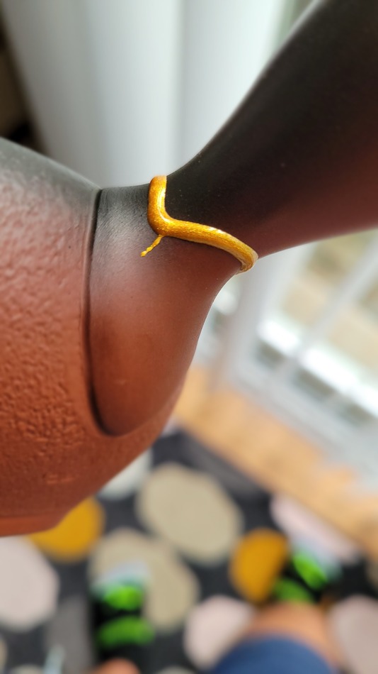 I think the epoxy color really complements the pot. Better even than "real" gold kintsugi.