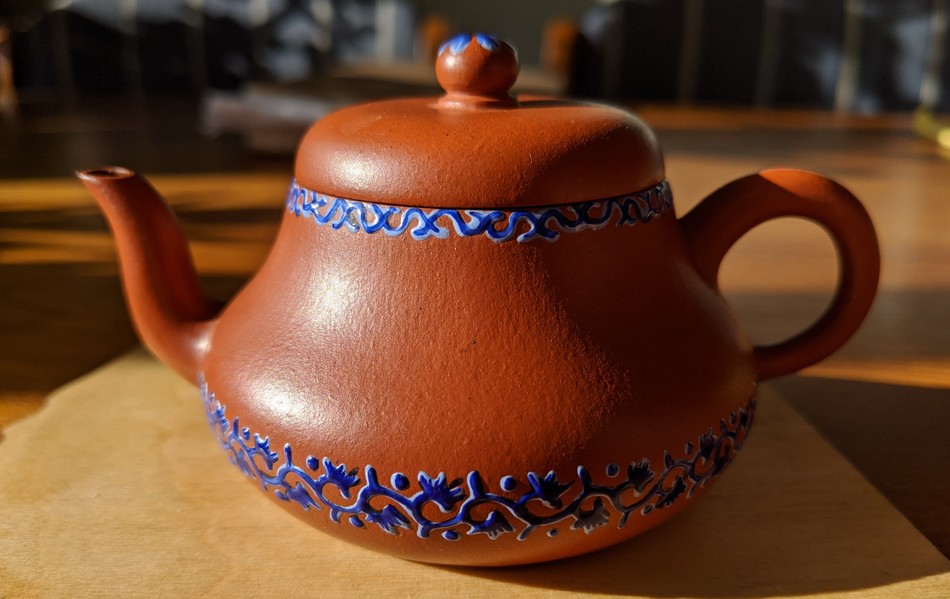 ~95 ml modern zhuni pot from Chawang Shop. I use this pot for aged sheng. The clay has very subtle wrinkles-- almost more of a shimmer-- that I find very difficult to take pictures of. The light this morning just happened to work to get them to show up in a photograph.