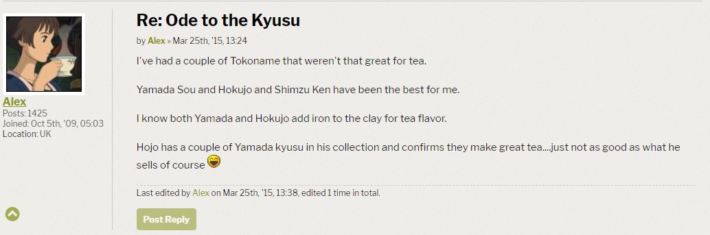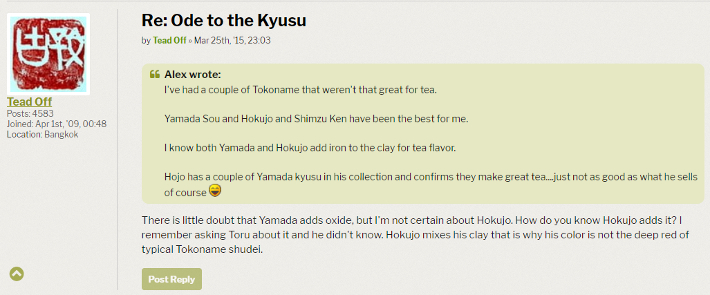 It seems well documented by users that the clay as far as color and texture as well as texture has changed quite a bit in Sou's hands. I am hoping still that whatever the changes are, Iron Oxide would not be the culprit for some of the changes! It seems strange to me (though not when thinking about my more familiar background with yixing pots) that Sou would claim his family had stores of clay built up just to say it...but if there is more motivation for him behind that with his reputation on the line, that would also be interesting to know more about
