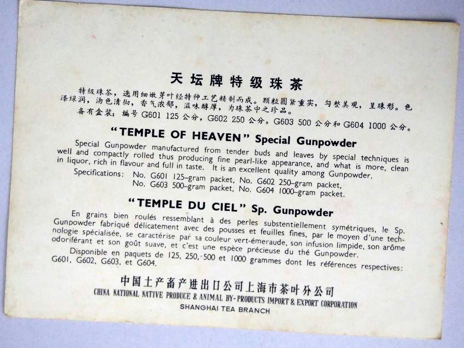 A postcard ad explaining the Temple of Heaven brand gunpowder green tea options available in paper packets instead of tins.