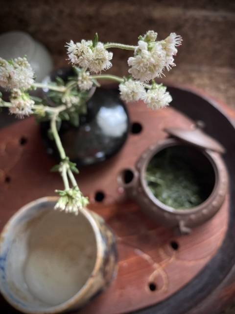 Just metaphorical sweetening by having the flowers on the tea table, no flowers added to the tea. I broke a few stems as I was photographing them this morning.