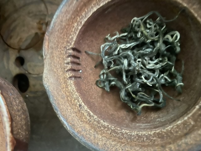 The scent of just the dry leaves of this one is insane: fruity, earthy, spicy, sweet....clearly roasted, but not smelling of the roast. It's amazing. I'm prepping only a tiny bit of leaf because it's already warming up too much for a long session of hot tea, so it is just 1.9 grams, which will have plenty of room in Petr's treebark pot.