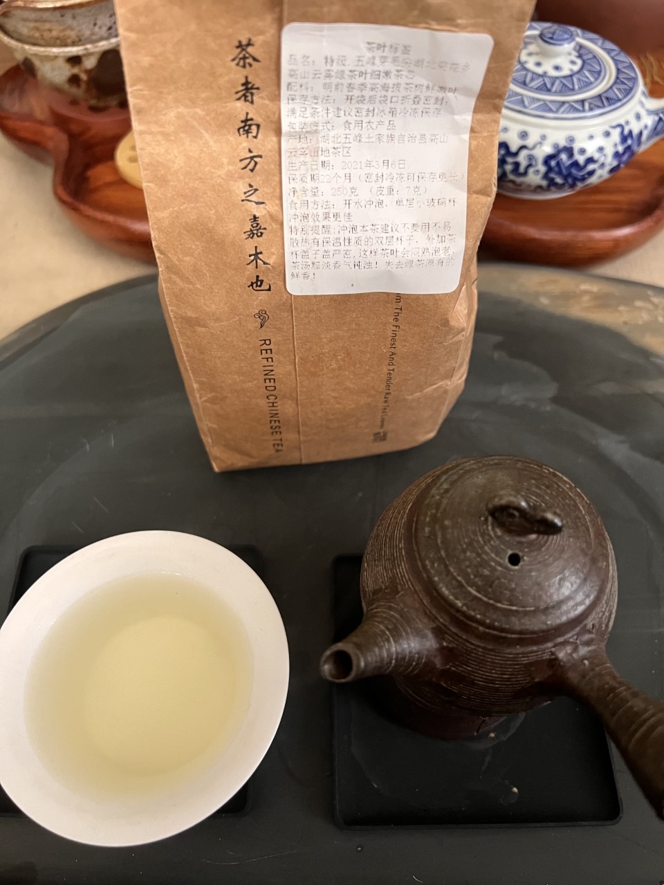 Chinese green tea + Japanese Kyusu + Gaiwan for drinking vessel. The Chinese green tea is Mao Jian from Hu Bei, China harvested in Spring of 2021.