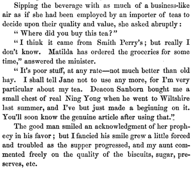 Also, how it was seen at home, in this case, as the favorite tea of a New Englander bride-to-be in Hannah Bradbury Goodwin's Sherbrooke from 1866.