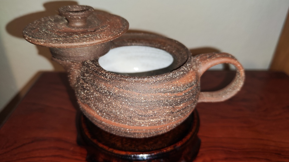 On a side note, I am really content with how the well shaped (as in "water well", but also otherwise) pot functions with ball rolled oolongs. I've got in the order of 8-10 grams in there and it is the only pot I have where the lid is never pushed up, even if the water volume is essentially halved by dense expanding leaves. The narrowing shape and wide rim around the lid seat hold it all down, and the tiny lid just falls into its permanent groove within the leaves. It always pours strongly when packed with a flat 14 or so hole filter. Since I am not shy about mixing the most ephemeral oolongs with their darkest roasted cousins in these dense pots, it's an absolute go to for all ball rolled leaves. It always feels like a bottomless container magic trick when I fish the expanded leaves out.