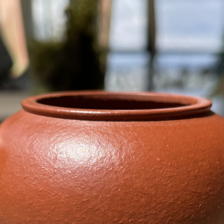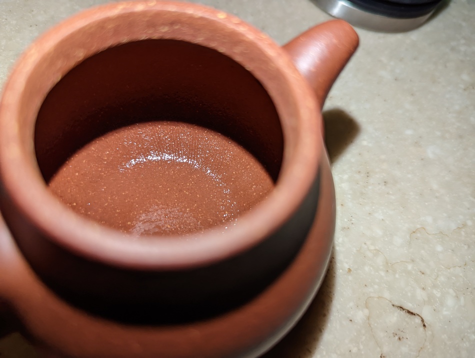 This pot is pretty young and confirmed my suspicion that it's probably just sebum from handling that produces a shine after a bit of use, quickly on dense clays, more slowly on more porous clays. Certainly not tea, as I do not pour tea over my pots, and they get rinsed with boiling water and externally dried with a soft cloth before I place them to dry out on the inside. That is not to say that routinely pouring tea over the pot won't evenly stain it with tea oils, it will, but that I have no practical interest in artificially cultivating the look of pots.