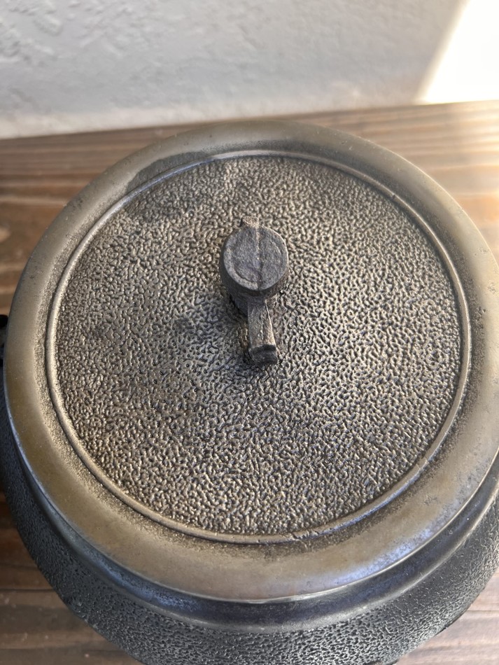 Hello everyone, I recently found this tetsubin at an antique store, and it is exactly what I've been searching for! Not sure of its age, but I'm thinking it's no more than 40 or 50 years old, based on condition. It seemed to be in decent shape, but there was some rust built up inside of it. It seems like that oxide layer has peeled off in some places, leaving rusty spots a few millimeters in diameter. So far I tried brushing the inside first with a brush made of natural material (like straw), just to get the big pieces off. Then I rinsed with water and boiled with some black tea. I let it sit for about 5 hours, drained and rinsed again. The rust was already turning black. So I boiled more black tea again and let it sit for around 15 hours. The tea that came out was even darker than before, almost black, and the rusty spots were more black than before. I boiled water once, and decided to do black tea once more. It is sitting and cooling off now.