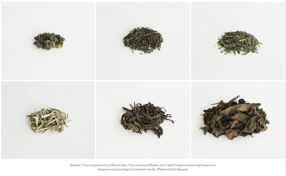 due to different leaf shapes and sizes, different teas have different densities. a scoop of one tea won't weigh the same as another, and that can result in unexpected flavor and strength differences.